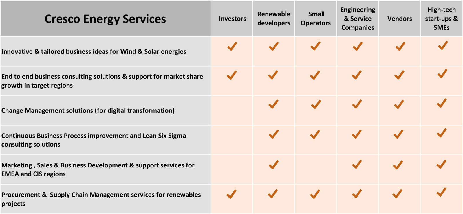 At Cresco Energy, we are committed to creating the Future with Clean Energy. We work together with international “Wind & Solar Power” developers, investors, service companies and vendors to expand their footprint, secure more projects and support them to reduce operational costs of projects, through a range of tailored business support and solutions.